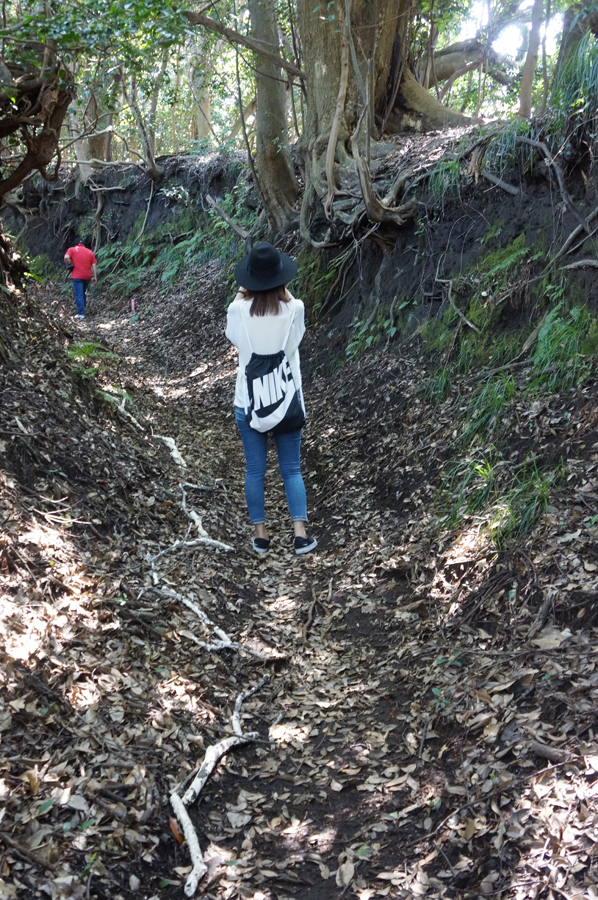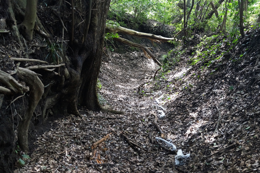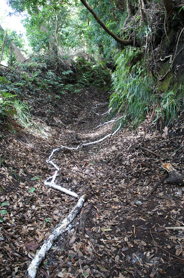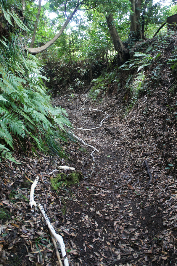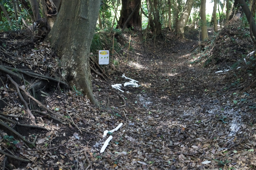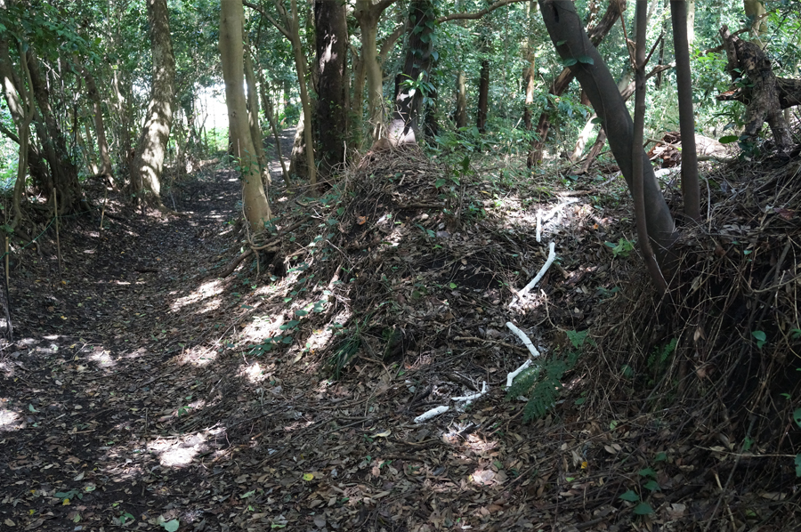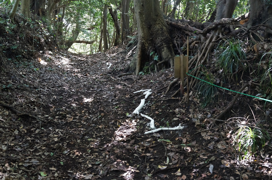 水のながれる僅かに露出した地面と落ち葉が重なる狭間に枯れ枝のラインを這わせた。犬の足跡の様に。