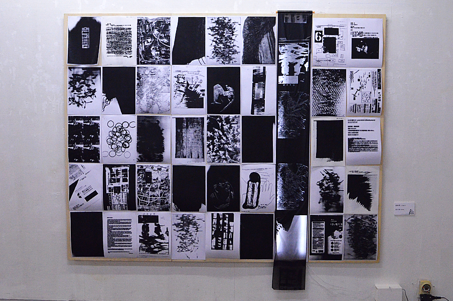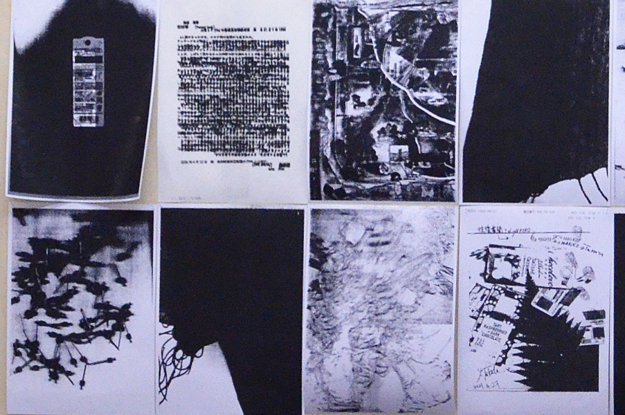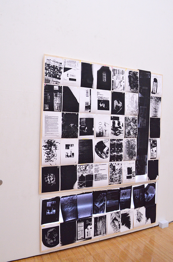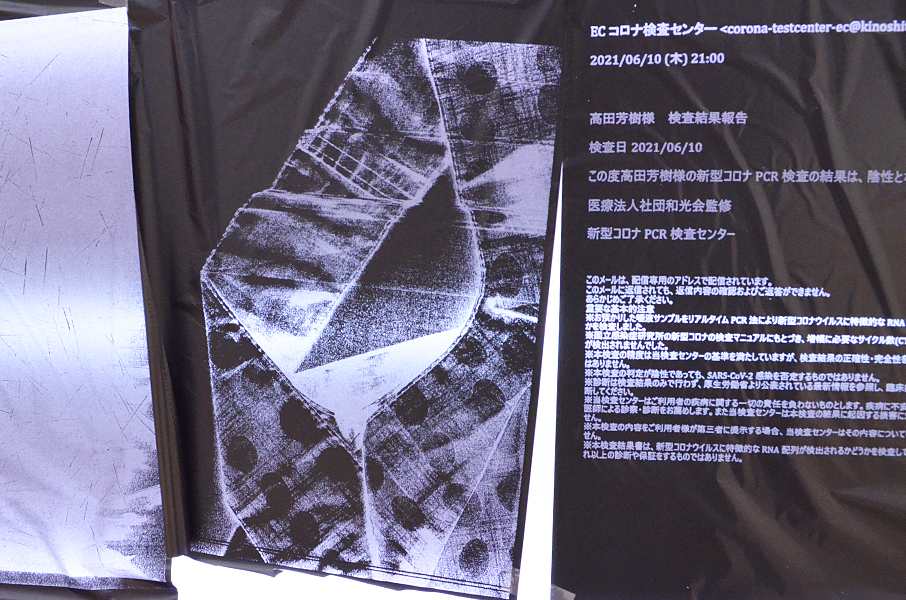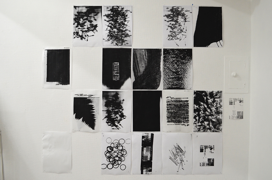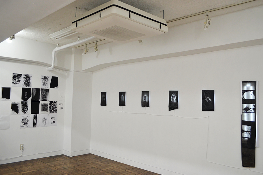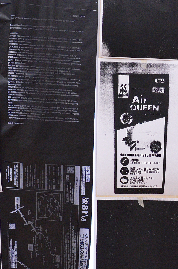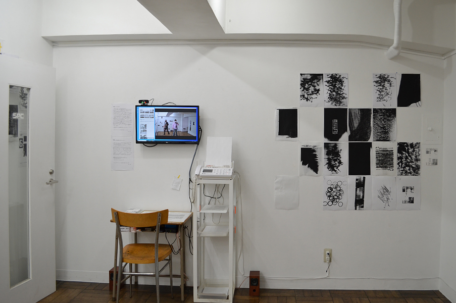 2人展では、FAX電話を会場と外部と接続手段の一つとして置いた。このFAXは「インクリボン」を使うものである。タイプライターや、ワープロ専用機に使われたカーボンリボンは、機械そのものが少なくなる中にあって、インクリボンのFAX電話はいまだ現行機種でもある。インクリボンをフィルムに蒸着させたカーボンを紙面に定着させる過程は分かりやすい。印字するときの機械音も過渡期末期ならでは懐かしき響きを奏でる。
