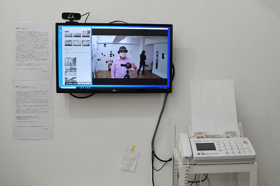 今を考えるために、遠隔(オンライン)の初期的形態のFAX電話機を会場に設置し使っていきたい。置かれているモニター(Zoom)は、FAX電話のサポート役として設置した。