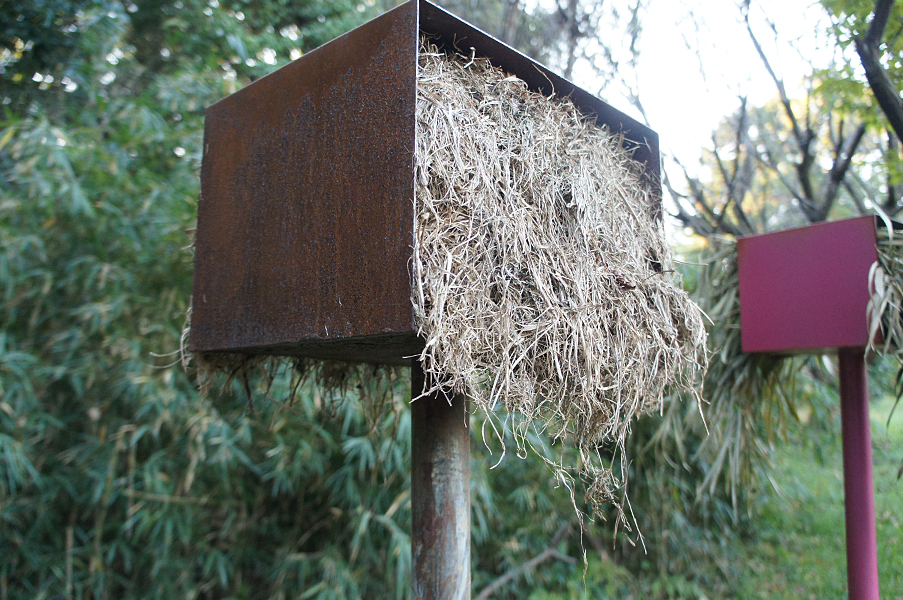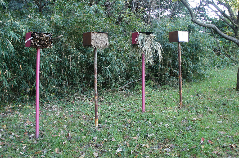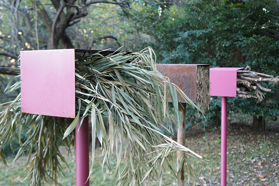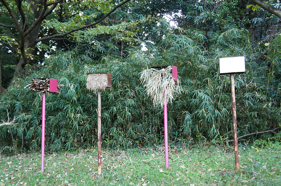 私は、いくつかの野外空間で展示をしてきた。盛岡(小岩井牧場の近く間の沢)・伊豆大島・新島・小笠原父島・埼玉県比企丘陵・香川県の「たんぼ」や「旧街道沿いの山道」・我孫子市の里山etc.