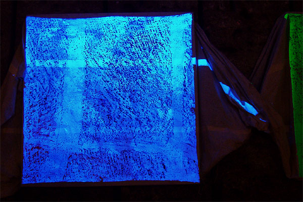 壁面がある。その壁面の、フロッタージュを、壁面より30センチほど手前に展示する。地下深く、暗闇に近い環境なので、ブラックライトで、壁面のフロッタージュを浮かび上がらせる。浮かび上がるものは、壁面の一番私に近い盛り上がった部分。