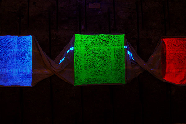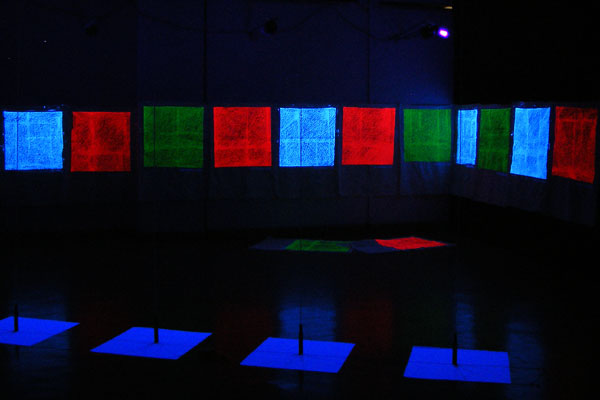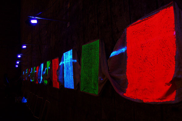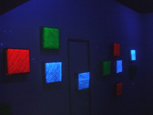 There are wall planes. Frottages of the wall are displayed in the 30 cm front from the wall. The frottages of the wall surface are emerged from the darkness by the black lights. Because the site is deeply under the ground and almost in dark environment. What emerged is the raised portion from the wall surface the nearest to me.