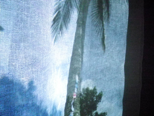 揺らめく、寒冷紗の作品上に、ジョグジャカルタでの展示風景が重なる。