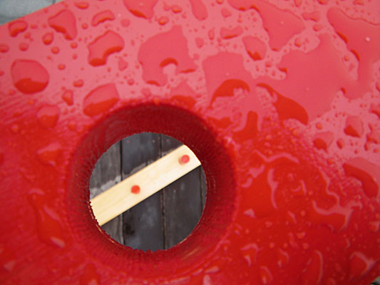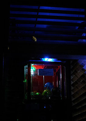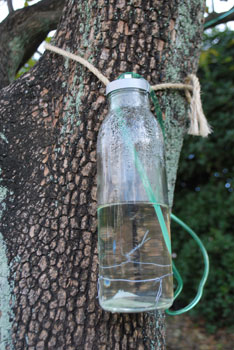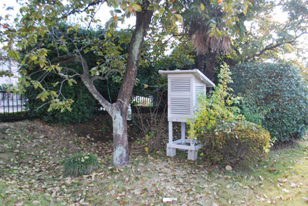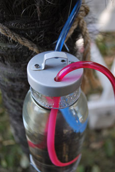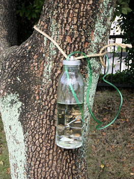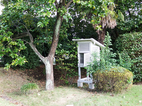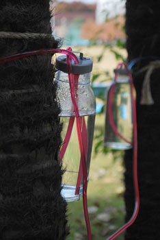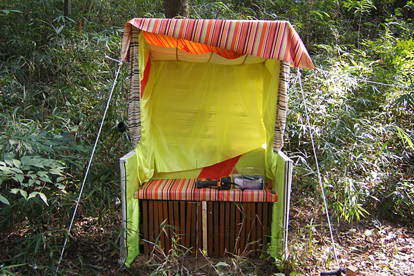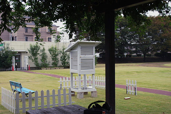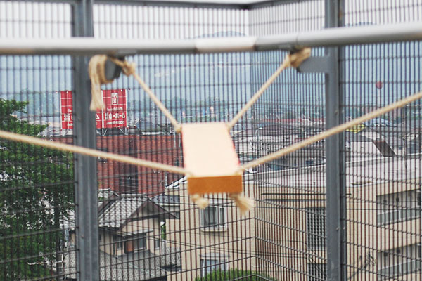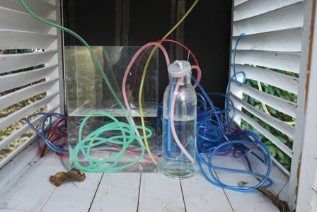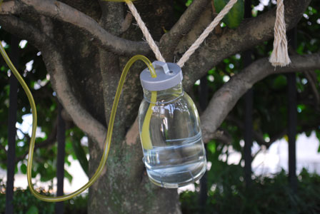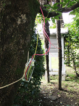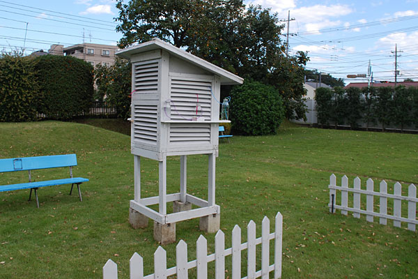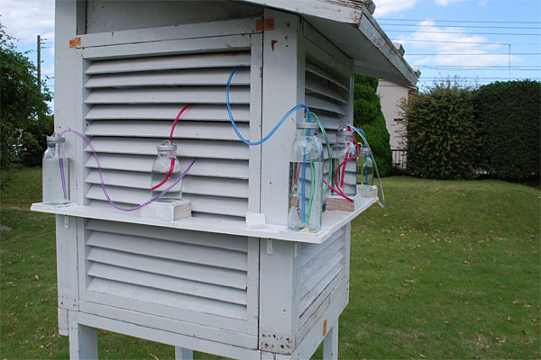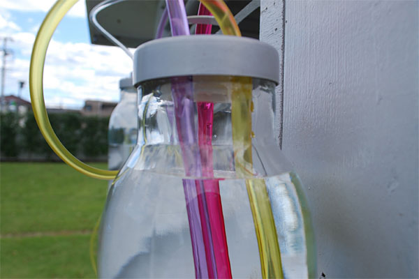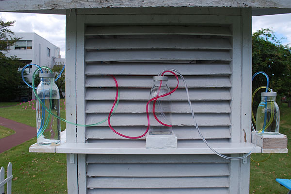 A thermometer screen was placed under the shade of trees and a water tank was installed inside the thermometer screen. The water tank and the bottles hung to trees are connected one to the other by tubes. The same surface of the water level of several square meters appeared in the air.