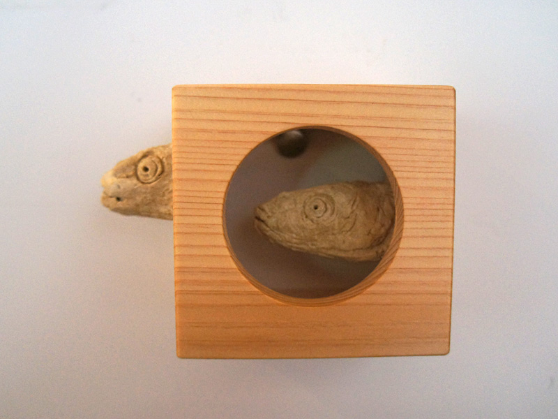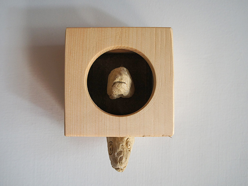 素材:一合桝、セラミック、オーブン粘土、一部アクリル絵の具、蜜蝋ワックス仕上げ