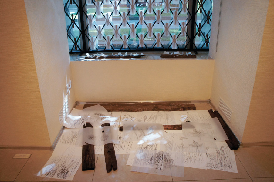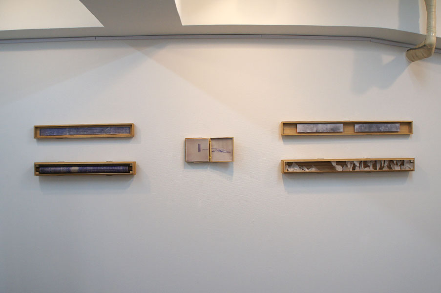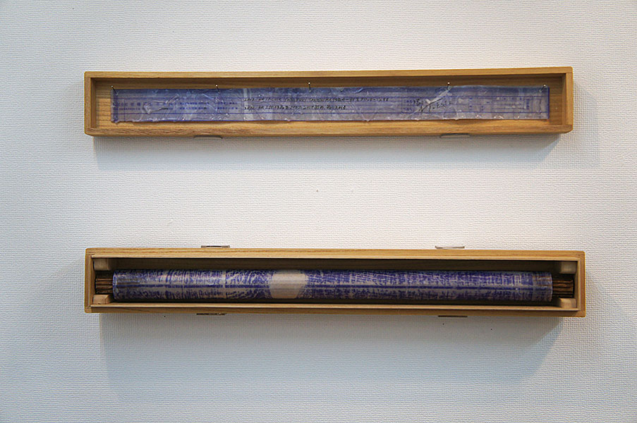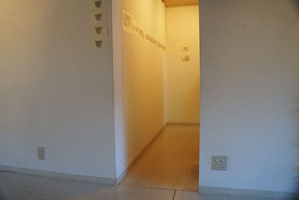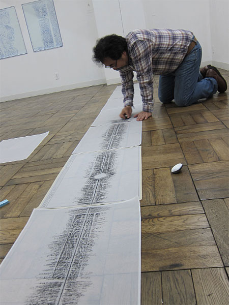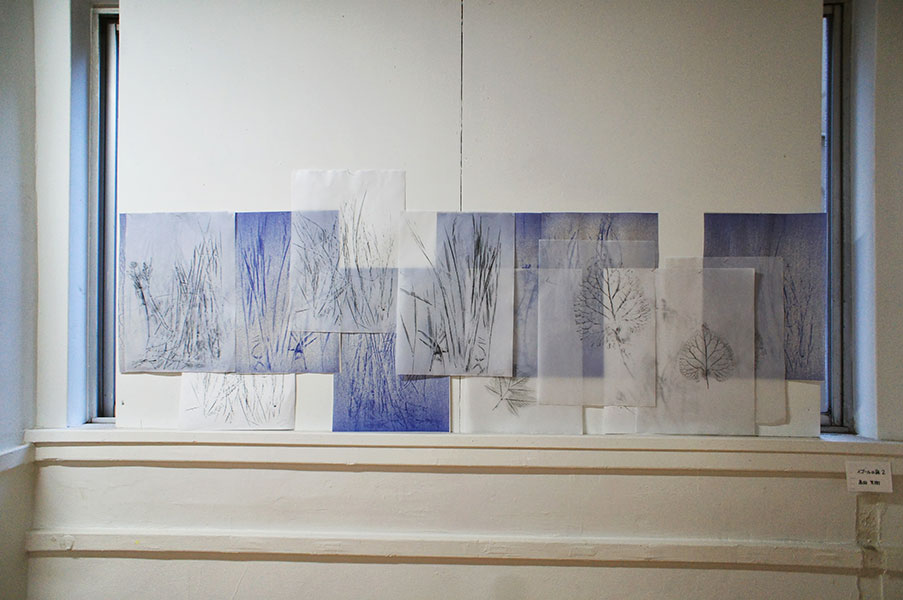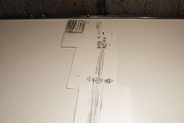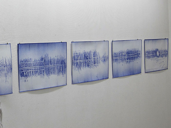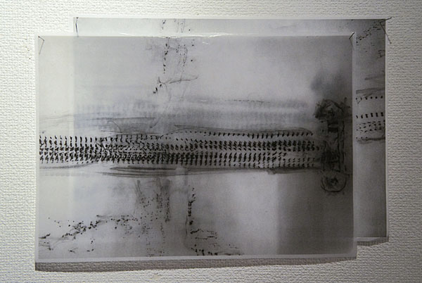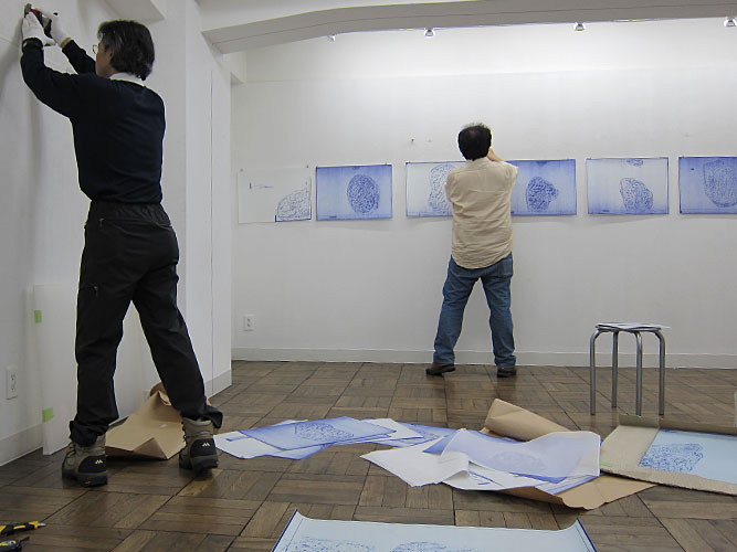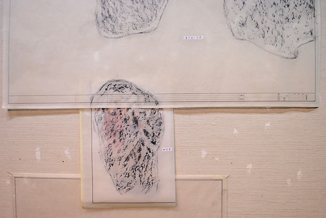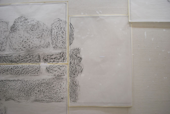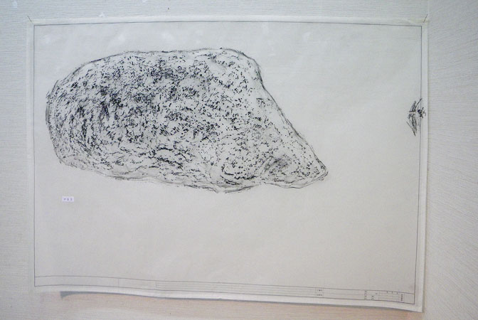 - フロッタージュしたトレーシングペーパーから、青焼きに転写した時、欠落して行くのは、多くのグレーの段階や、擦る出す時の腕の動きなどの痕跡等である。青焼を提示することは、さらなる実物からの乖離である。対峙した者は、実物は何なのかを想像し想像を巡らす、乖離の深度の分だけ浮遊する精神を受け止める狭間が生まれ、浮遊する精神を意識する。