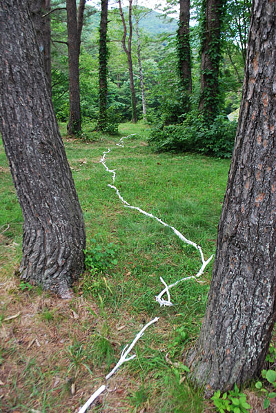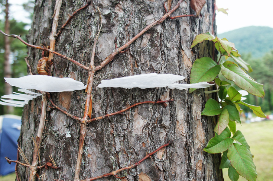 - 私は、この森をこの木々を出来るだけ自然のまま生かしたかった。木々に痛みを伴わない形で寄り添う事が出来ないか模索した。最終的に手で触れることが出来る熱さをもって、樹に私の証を付けノートに太さを記録した。